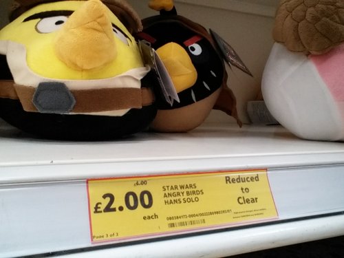 Tesco have star wars angry birds soft toys half price in Baguley tesco Manchester, not sure if it's store specific, I got 2 different ones for my young sons tonight