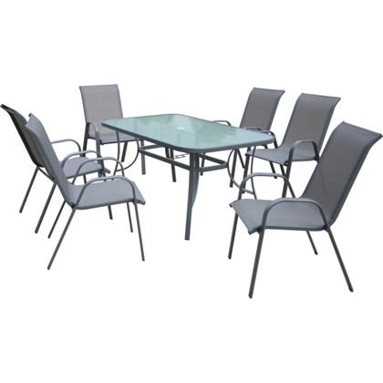 Stunning and stylish, this 7 piece outdoor sling back setting would be a great addition to any garden or patio. This sleek charcoal furniture set consists of a tempered glass table top and 6 textiline arm chairs which stay cool on hot days, and are weather resistant.