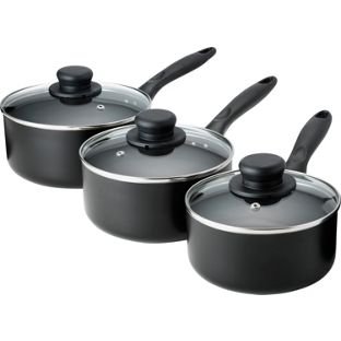 This three piece pan set consists of three different-sized black pans that are made from aluminium for efficient heat distribution. Each pan has a non-stick coating and a steam vent lid to prevent liquids from boiling over. Suitable for gas and electric hobs, these pans have bakelite handles that can withstand high temperatures.