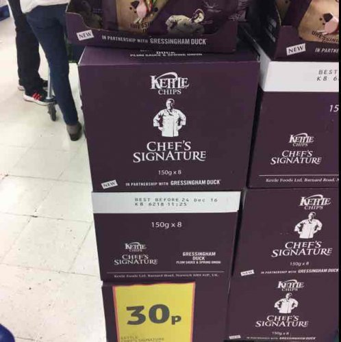 Kettle crisps Duck, plum sauce and spring onion 30p. 150g (big bag). Found at Tesco Wester Ave