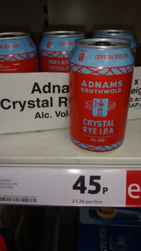 Adnams Crystal Rye IPA. Decent craft ale at 45p a can.