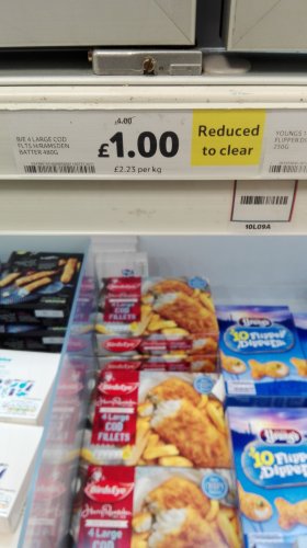 Large battered cod fillets by Harry Ramsden / Birdseye. Spotted in Dundee Riverside. Down from £4 to £1, not sure if national.