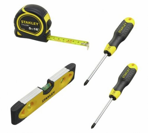 Perfect for those who are new to DIY, looking to build up a tool collection. This Stanley Starter Hand Tool Kit gives you a 5m/16in Tylon tape measure, magnetic 9in Torpedo Spirit Level with rubber end caps for durability and 2 cushion grip screwdrivers (Phillips PH2 and Parallel 75mm) featuring magnetic tip and corrosion resistant chrome plated car. Bit holder. Spirit level. Measuring tape, . Magnetic 9in Torpedo Level with rubber end caps for durability and 2 cushion grip screwdrivers featuring magnetic tip.