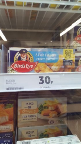 fish fingers are never 100% fish unless you make it yourself at home, they are mostly processed bits of fish so it doesnt matter they all taste same with ketchup and for 30p perfect cannot go wrong.