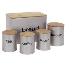 Keep your condiments, biscuits and bread stored away to retain their freshness with this ColourMatch 5 Piece Wooden Lid Storage Set in Silver. The set features simplistic signage so you will always know what is in each tin.