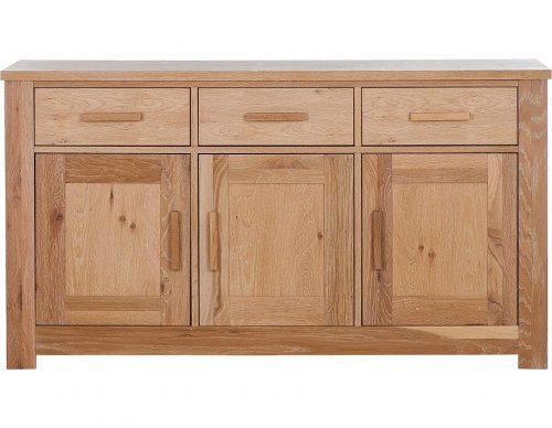 With a reassuringly solid design crafted from rustic oak, The Harbury Collection is made to stand the test of time. Lightly whitewashed large sideboard with panel detailed top, three doors, three soft close drawers and solid wooden handles.