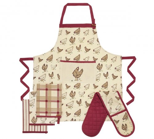 Great reviews on site, each set comprises of a cotton apron, oven gloves & 3 tea towels.