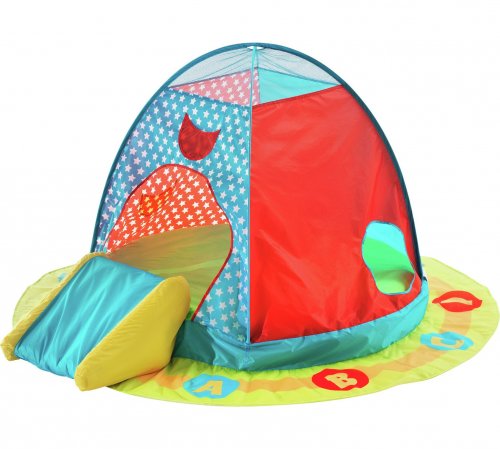 Babies will love this fun adventure play zone to help and encourage them to explore the world. Featuring brightly coloured print with sensory elements babies will have fun creating noises or playing peek a boo through the mesh roof. Crawling through the door and down the soft inflatable slide provides endless active fun for little ones!