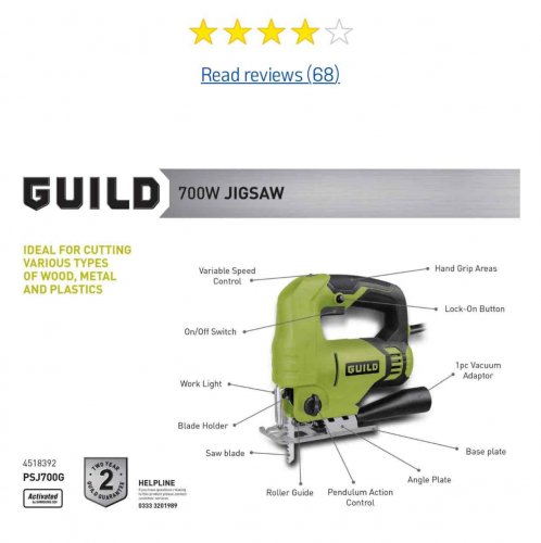 Guild Variable Speed Jigsaw - 710W with 2 years warranty was £32.99 now £21.99 (68 Reviews) at Argos item number: 451/8392