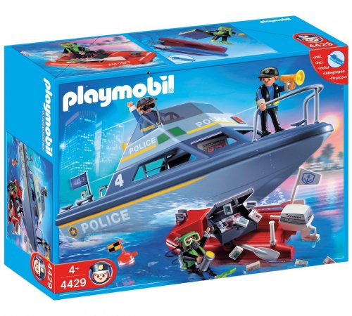 The Playmobil Police Boat includes 3 Playmobil figures. The river police are out in their fully equipped boat with GPS, satellite phone and loud speaker system. The underwater motor propels them quickly to the scene where a frogman has uncovered the hidden loot with the use of his outboard dinghy.