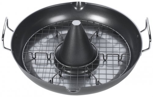 I just purchased one and it is larger than I expected. It looks a little like a large Mexican Hat that can allow for plenty of veg to be roasted along with the chicken. For this purpose, a removable rack is provided which sits below the chicken.