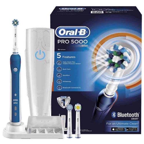 The Oral-B PRO 5000 SmartSeries electric toothbrush with Bluetooth is the world's first of its kind with Bluetooth connectivity. Bluetooth communication allows the brush to connect with your Oral-B App to provide real time brushing guidance that can be adjusted by your dental professional. Also receive focused care through personalized dental care journeys to meet your specific oral care needs. The professionally inspired design of the CrossAction toothbrush head surrounds each tooth with bristles angled at 16 degrees, and 3D cleaning action oscillates, rotates, and pulsates to break up and remove up to 100% more plaque than a regular manual toothbrush. The pressure sensor lights up if you brush too hard to prevent harmful over-brushing and there are 4 modes - Daily Clean, Gum Care, Sensitive, and Whitening - and a timer to help you brush for a dentist-recommended 2 minutes. Best of all, it's brought to you by Oral-B - the #1 brand used by dentists worldwide.