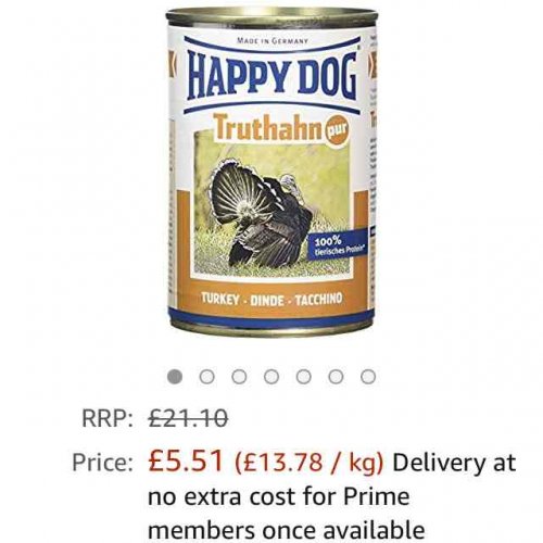 Happy Dog 400g (Pack of 12) dog food tin Turkey £5.51 Prime or £10.26 non prime @ Amazon (upto 3 weeks delivery)