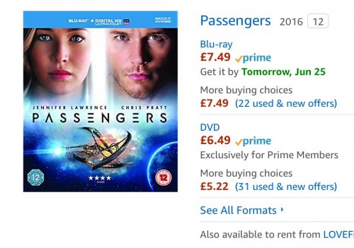 Passengers blu ray/DVD £7.49 prime / £9.48 non prime @ Amazon
