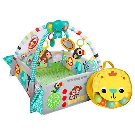 This isn't your average play gym! The 5-in-1 Your Way Ball Play™ Activity Gym from Bright Starts™ is a 48" jumbo mat and play gym with walls that can be adjusted up or down. Walls up keeps balls inside and acts as a barrier during play time and tummy time. 35 colorful balls extend the life of this gym into the toddler years because with all walls up - it becomes a ball pit! Engaging toys include an electronic toucan that entertains baby with over 20 minutes of merry melodies. A plush elephant, monkey bead chaser and more jungle themed toys including leaf-shaped teethers, a discover me baby safe mirror, crinkle fabrics, rattles, prop pillow and even a character bag to help baby experiment with put and take development. From tummy time to toddler time, baby will be having a ball!